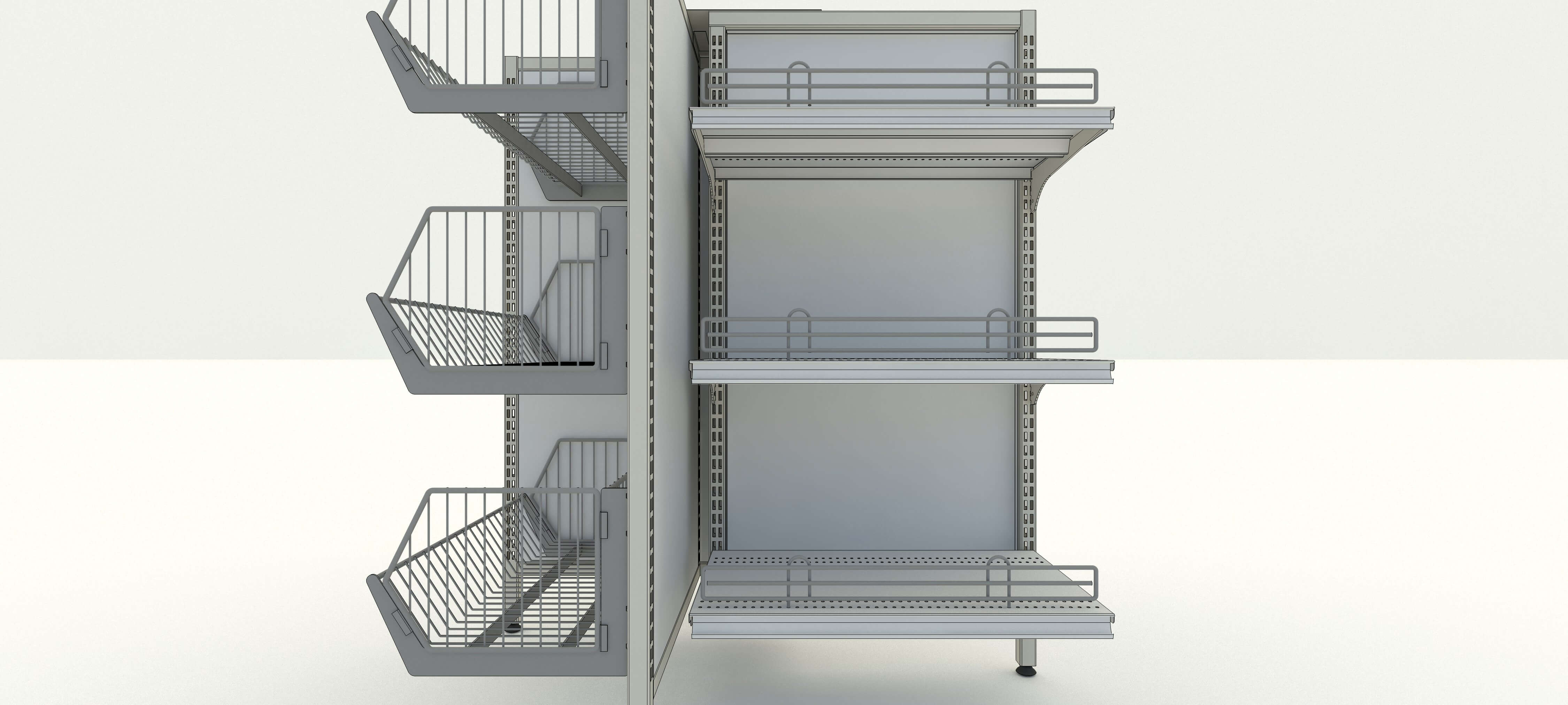 Four-way display shelf / Supermarket display rack / Retail gondola shelving / Promotional display stand / Compact retail shelving / Metal display rack / Space-saving shelf unit / Central display shelf / Store fixture display / Multi-directional retail rack